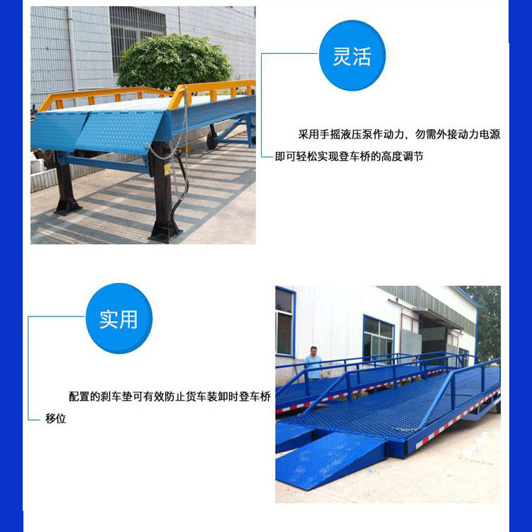 移動(dòng)式登車橋應(yīng)用于無裝卸站臺(tái)或裝卸位置不固定以及裝卸場(chǎng)地狹小等場(chǎng)合,實(shí)現(xiàn)了貨物快速裝卸。通過它使叉車等搬運(yùn)車輛直接進(jìn)入貨車、集裝箱、列車車廂裝卸貨物,大大的提高了工效。登車橋采用手動(dòng)液壓操縱,無需其它動(dòng)力,能適用于各種裝卸場(chǎng)合;登車橋采用支腿支撐和網(wǎng)格狀鋼板結(jié)構(gòu),有更可靠的安全性能。
